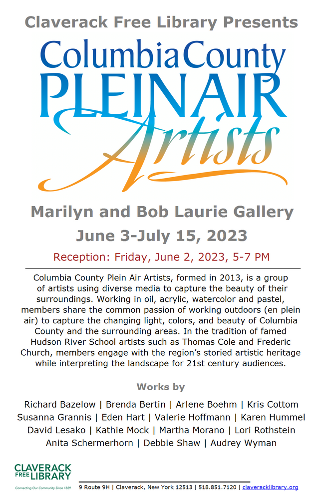 Columbia County Plein Air Artists Opening ReceptionFriday, June 2, 5-7pm Claverack Free Library9 Rt 9HClaverack, NY 12513 Date Jun 02 2023 Expired! Time 5:00 pm - 7:00 pm